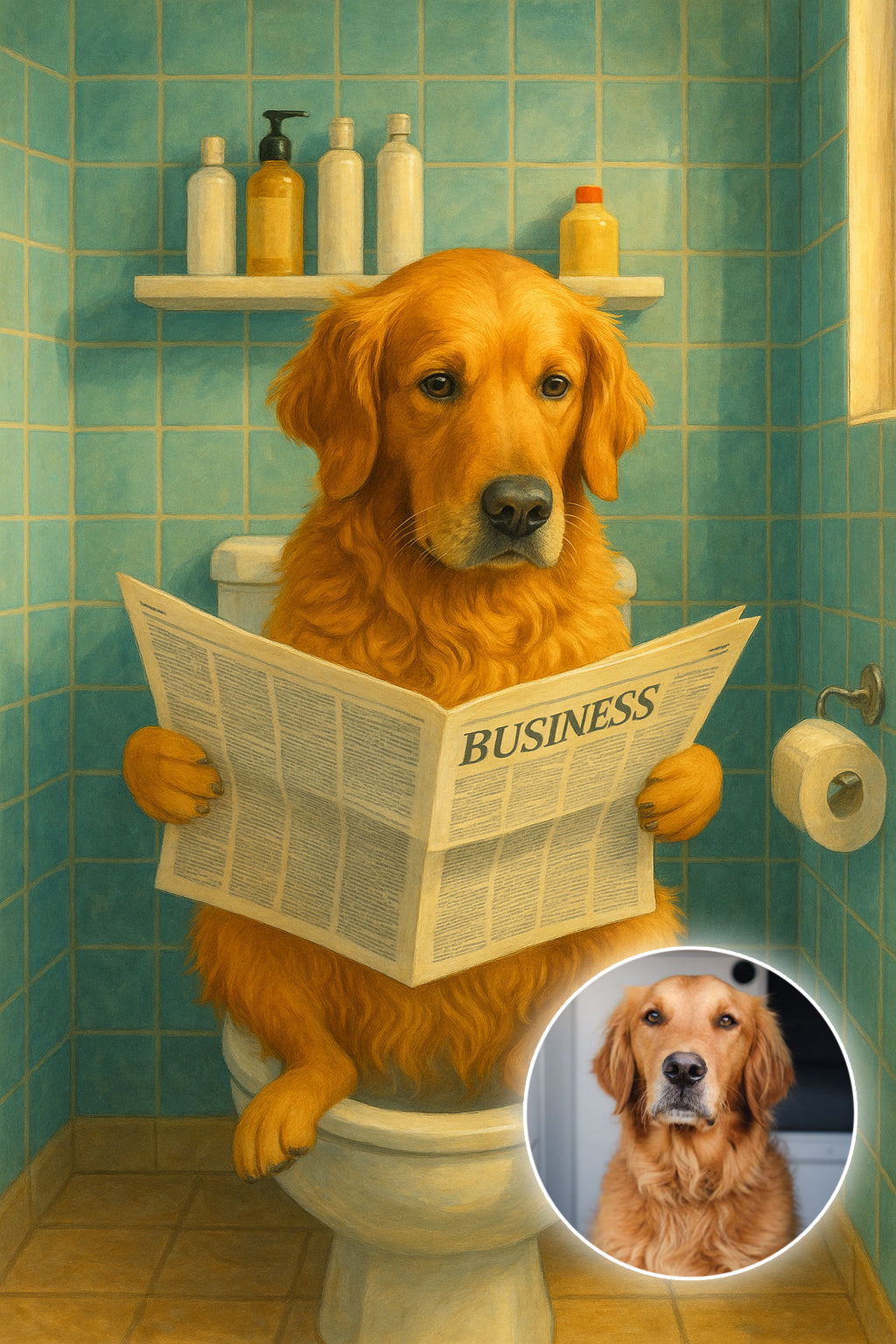Personalised Pet Print - unframed A4 print printed on professional 260gsm. An illustration of YOUR dog sitting on a toilet - concentrating.